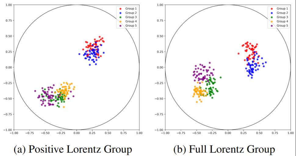 论文题目:FlorE: Integrating Full Lorentz Group and Directional Offsets for Effective Knowledge Graph Embedding 作者:多泽华(内蒙古大学25级博士研究生),李江(内蒙古大学22级博士研究生), 苏向东(内蒙古大学副教授)(通讯作者),高光来 (内蒙古大学教授) 论文简介:本文聚焦知识图谱嵌入在复杂关系上的推理能力提升,针对现有欧氏/复数/双曲空间方法难以建模的 Z-Paradox 关系模式,提出 FlorE 框架。FlorE 框架将关系映射从正Lorentz 群拓展到完备 Lorentz 群,使同一关系可执行不定度量下的等距变换,有效避免实体在流形中的映射重叠与由此导致的尾实体混淆。同时,我们基于指数映射设计了定向偏移操作,把关系与实体统一到同一 Lorentz 流形,实现几何一致的表示学习;两项技术的协同,使模型在Z-Paradox关系模式上具备更强的区分与表达能力。在五个基准数据集 WN18RR、FB15k-237、CoDEx-S/M/L 上,FlorE 总体达成或刷新现有最优表现。尤其针对 Z-Paradox 关系,方法相对强基线在各数据集上的提升幅度分别达到 26.7%、15.6%、35.4%、33.7%、31.5%,验证了所提几何建模思路的有效性与稳健性。图中展示了对两个 Z-Paradox 关系的尾实体嵌入进行可视化对比,采用完备洛伦兹群的模型显著提升了类间分离度与判别性。 |