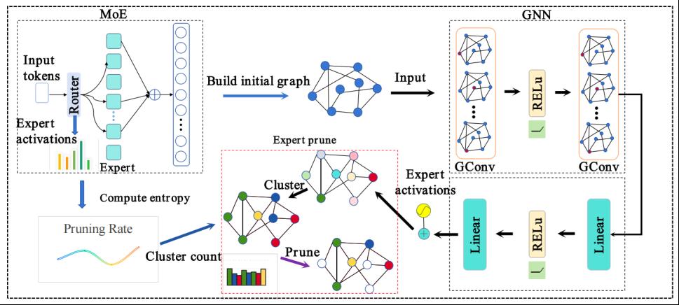 论文题目:C-GNN-PRUNE: A Unified Graph-Based Framework for Structure-Aware Pruning of Mixture-of-Experts Models 作者:李林(内蒙古大学24级硕士研究生)、王燕(内蒙古大学 副教授)(通讯作者)、王卓鹏(内蒙古大学24级硕士研究生) 论文简介:稀疏专家混合(MoE)结构在扩展大型语言模型(LLMs)方面展现出卓越的计算效率,但其庞大的参数规模仍然制约了部署效率。现有剪枝方法多忽视专家间的结构依赖与层间异质性,导致剪枝后性能退化与结构破坏。针对上述问题,本文提出统一的结构感知剪枝框架 C-GNN-PRUNE,通过图神经网络(GNN)建模专家间的交互关系,实现基于结构的专家选择与压缩。该框架首先设计基于熵的层级剪枝分配策略,根据专家激活分布熵自适应分配剪枝预算;随后构建专家交互图,融合输出相似度与路由差异信息,经由两阶段GNN学习结构感知嵌入;再通过社区检测机制识别功能冗余的专家簇,并在簇内基于激活频率执行保留与裁剪,从而在稀疏性与表达力间取得平衡。在 DeepSeek-V2-Lite、Qwen1.5-MoE-A2.7B 与 Mixtral-8×7B 三个开源模型上的实验结果表明,C-GNN-PRUNE 在不同剪枝率下均能显著提升压缩后的模型性能稳定性与任务泛化能力。与 C-PRUNE、EEMoE、Wanda 等方法相比,本方法在平均任务精度上最高提升达 4.3 个百分点,在保持高压缩比的同时有效维持模型表达多样性。该研究为实现结构保持、低资源开销的 MoE 模型压缩提供了一种统一且可扩展的解决方案。 |