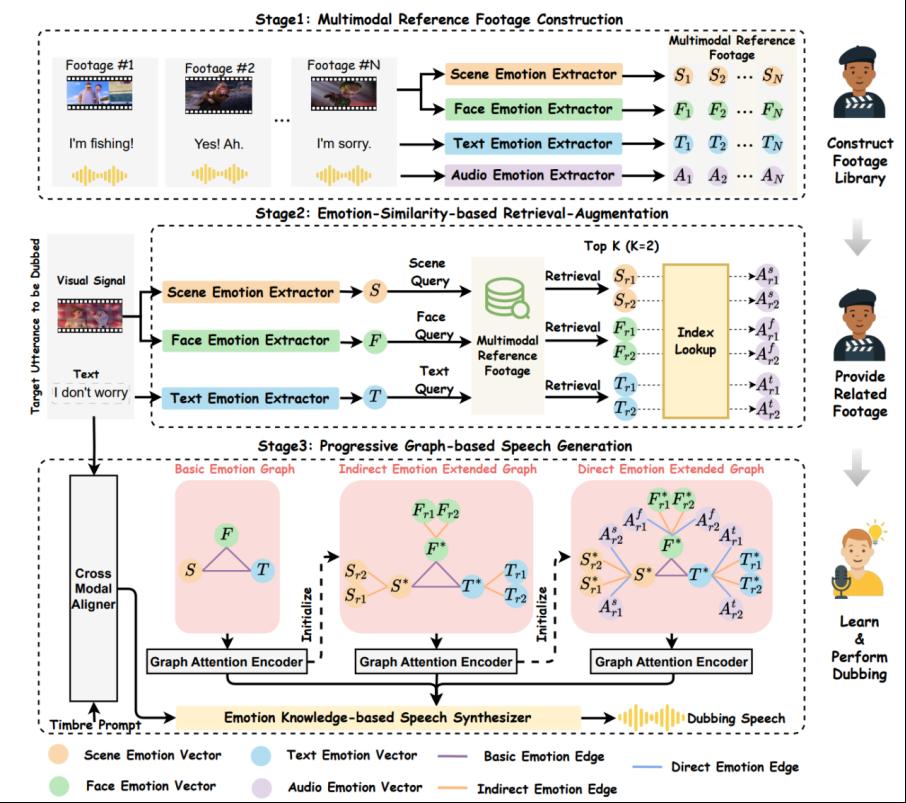 论文题目:Towards Authentic Movie Dubbing with Retrieve-Augmented Director-Actor Interaction Learning 作者:刘瑞(内蒙古大学 教授)、赵源(内蒙古大学25级博士研究生)、贾真琦(内蒙古大学25级博士研究生) 论文简介:自动电影配音模型能根据给定剧本生成生动语音,通过简短的音色提示还原说话 人的音色,同时确保与无声视频的口型同步。现有方法模拟了演员直接配音且无需准备的简化流程,忽略了关键的导演- 演员互动环节。相比之下,真实配音流程涉及动态协作:导演会积极与演员沟通,引导他们在配音前内化语境线索,尤其是情感层面的线索。为解决这一问题,我们提出一种新的检索增强型导演 - 演员互动学习方案,以实现真实感电影配音,该方案被命名为Authentic-Dubber,包含三大创新机制:(1)构建多模态参考素材库,模拟导演提供的学习素材。通过整合大型语言模型(LLMs),实现对跨模态信号情感表征的深度理解。(2)提出基于情感相似度的检索增强策略,模拟演员在配音过程中高效、全面内化导演提供素材的过程。该策略会检索与目标无声视频最相关的多模态信息。(3)开发基于渐进式图结构的语音生成方法,逐步融入检索到的多模态情感知识,从而模拟演员的最终配音过程。上述机制使Authentic-Dubber 能够忠实复刻真实配音流程,在情感表现力上实现全面提升。在 V2C-Animation 基准数据集上的主观和客观评估均验证了该方案的有效性。 |