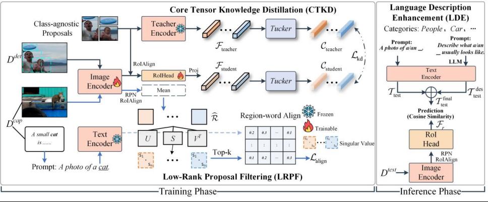 论文题目:Tensor Decomposition and Language Description for Open-Vocabulary Object Detection 作者:梁秋雨(内蒙古大学24级博士研究生),张永强(内蒙古大学)(通讯作者) 论文简介:开放词汇目标检测(Open-vocabulary Object Detection,OVOD)旨在突破固定类别限制,实现对未见目标的检测与识别。虽然现有研究基于区域-词语对齐(region-word alignment)和知识蒸馏(knowledge distillation)方面取得了进展,但其性能仍受三大问题制约:区域与词语对齐不精确、知识蒸馏存在冗余传递,以及类别嵌入表示质量较低。针对上述问题,本文提出了一种结合张量分解(Tensor decomposition)与语言描述(Language descriptions)的新颖的开放词汇目标检测框架,TLDet。在传统方法中,最高相似度得分的候选框常聚焦于判别性强但局部不完整的区域(如仅包含目标头部),导致区域-词语对齐偏差。为此,本文提出了低秩候选框筛选模块,通过奇异值分解计算候选框特征矩阵的奇异值之和,定量衡量其结构完整性,从而筛除判别性强但不完整的区域,显著提升视觉区域与文本语义之间的对齐精度。为避免知识蒸馏过程中的信息冗余,TLDet进一步引入核心张量蒸馏方法。该方法基于 Tucker 分解,将教师模型与学生模型的特征映射为核心张量,通过核心张量的优化对齐,实现高效且有选择性的知识迁移,使学生模型能够聚焦于教师模型中的关键特征表示。此外,为增强类别语义嵌入的表达能力,本文设计了语言描述增强机制。该机制在推理阶段引入大语言模型(LLM)的语义知识,通过生成丰富的类别语言描述,弥补开放词汇场景中长尾类别和模糊类别的语义缺失问题,从而提升类别嵌入的区分性与泛化能力。在 COCO 与 LVIS 主流开放词汇目标检测数据集上的实验结果表明,TLDet 在新类别检测任务中表现突出,分别取得 36.1% 的 mAP 和 30.1% 的 mask mAP,显著超越现有开放词汇检测方法,验证了其在开放世界视觉理解中的有效性与优越性能。 |