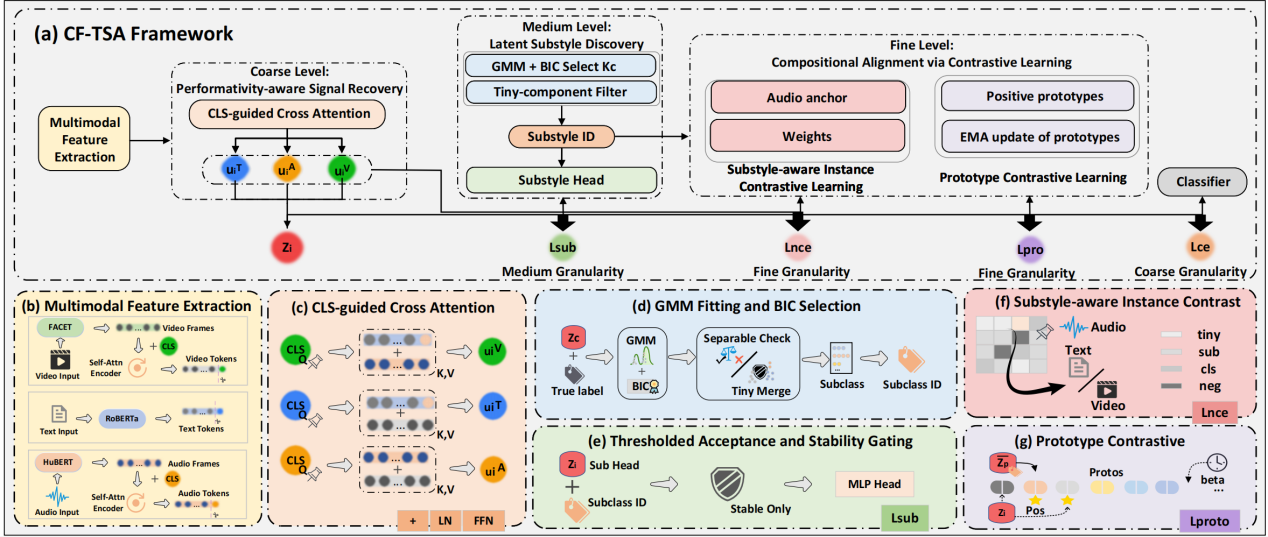 不同于日常情绪表达,教师在课堂中的情感往往受到教学目标、职业规范与互动任务的共同约束,呈现出明显的表演性、类内异质性和跨模态组合性,因而难以用单一静态标签充分刻画。针对这一挑战,论文提出一种由粗到细的多粒度多模态框架 CF-TSA,将教师情感分析系统拆解为三个层次:在粗粒度上恢复受职业性表达调节的有效情感信号,在中粒度上发现同一情感类别内部的潜在子风格,在细粒度上对齐文本、语音与视觉线索之间的互补组合关系。实验结果表明,该方法在教师领域数据集 T-MED 以及通用多模态情感基准 CMU-MOSEI 上均取得了优异表现,验证了层级化建模对于理解复杂教师情感表达的有效性,也为智能教育场景下的多模态情感计算提供了新的研究思路。
