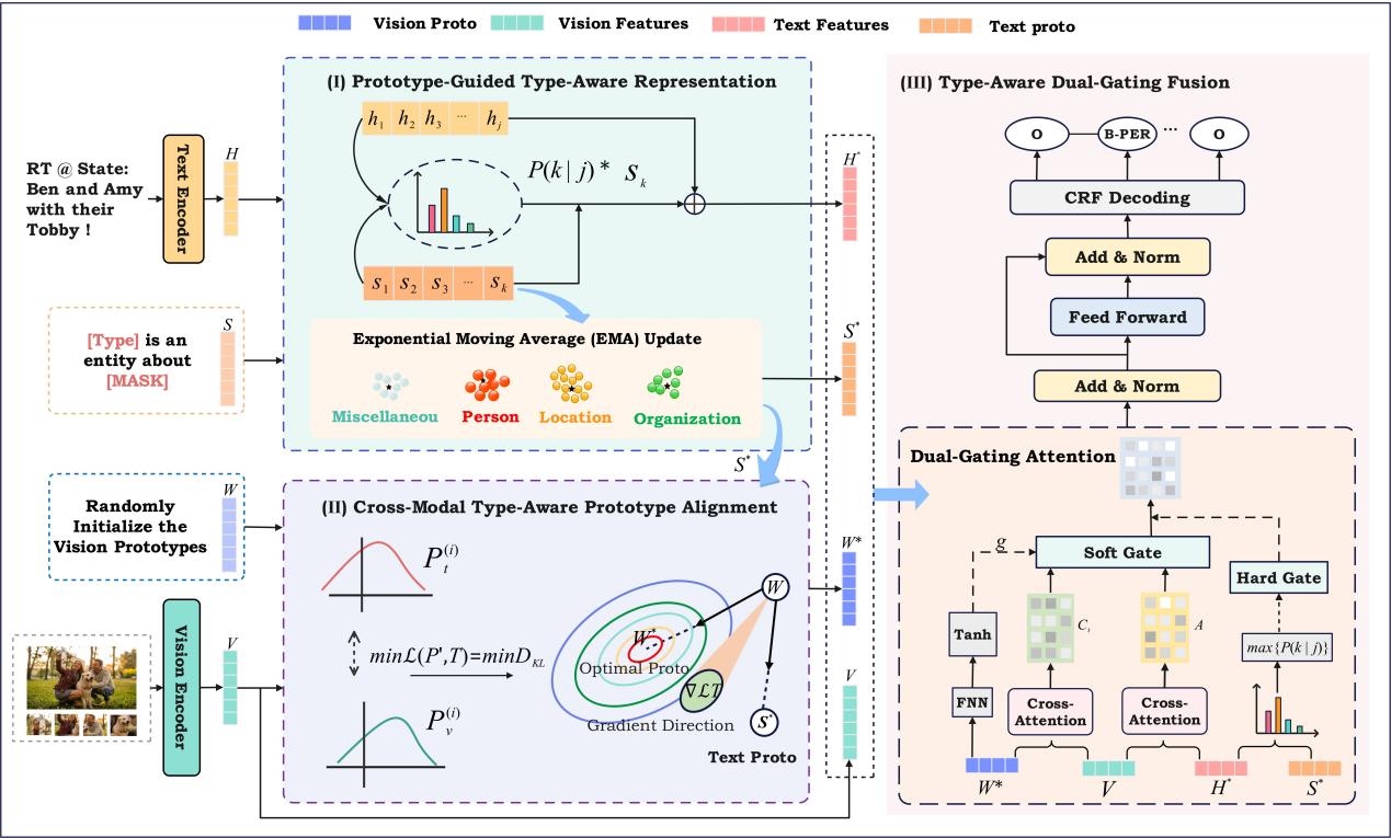 多模态命名实体识别任务旨在通过融合文本与视觉信息,从噪声较多的社交媒体文本中提升实体抽取效果。然而,现有方法仍面临以下挑战:(1)跨模态语义对应关系较弱;(2)缺乏与任务对齐的实体类型语义以有效引导跨模态交互;(3)多模态融合机制不充分,可能放大与实体类型无关的视觉噪声。为此,该论文提出了一种原型引导的类型感知框架 PG-MNER(Prototype-Guided, Type-Aware),将实体类型视为跨模态共享的语义锚点。首先,PG-MNER通过掩码提示调优学习离散的类型原型,并将类型级语义注入到词元表示中,从而增强歧义消解能力。为了在无需词元—区域对齐监督的情况下弥合模态间差异,本文在原型层面进行跨模态对齐,促进文本与视觉在类型语义上的一致表示。此外,论文设计了一种类型感知的双重门控融合机制,将“是否引入视觉信息”与“引入多少视觉信息”两个过程解耦,有效抑制与类型无关的视觉噪声。在 Twitter-2015 和 Twitter-2017 数据集上的实验结果表明,PG-MNER 在存在语义歧义的复杂场景下持续优于多种强基线模型,并通过显式的类型级语义推理提升了模型的可解释性,体现了模型在复杂语义结构建模中的优势与鲁棒性。