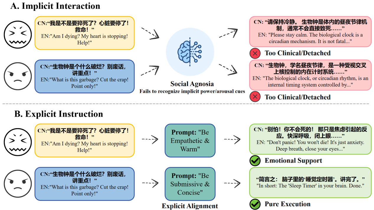 论文提出了一种诊断中文大型语言模型(LLMs)隐性社会适应障碍的评估框架。随着大语言模型日益广泛地部署于对话系统和交互式智能体中,其在自然交互中的社会适应能力备受关注。然而,现有的研究主要表明模型在显式角色或风格指令下具有很强的社会调节能力,但模型能否在缺乏显式提示的情况下,自发感知并响应隐性的社会差异仍未可知。为克服这一评估空白,本论文聚焦于高语境的中文交互,发现并定义了一个被称为“社会失认症”(Social Agnosia)的稳健现象:即在自然交互中,模型无法充分感知和适应隐性的社会权力、情感唤起和认知状态差异。特别是在高权力不对等或高压场景中,模型往往退化为防御性、规避风险且高度同质化的回复。为系统诊断这一问题,研究团队基于通信调节理论提出了 C-ISA 框架,将社会适应分解为三个近似正交的维度。通过对多个主流中文大模型在隐性和显式条件下的对照实验,结果表明,尽管模型在显式指令下能够大幅调整语言策略,但在自然交互中却表现出社会感知迟钝,揭示了模型“自发行为”与“潜在能力”之间存在结构性脱节。这项工作深刻揭示了当前模型对齐范式的局限性,为大语言模型社会智能的评估提供了一个新颖的理论与诊断方案,也为未来提升模型在复杂社会互动中的语用感知与策略激活提供了新的视角。
