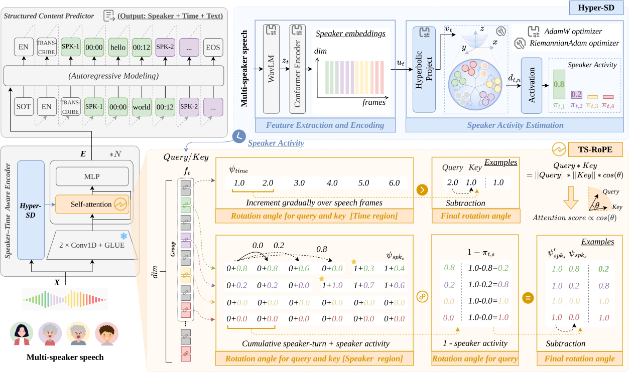 多说话人自动语音识别(MASR)的目标,是从多说话人语音中预测“谁在何时说了什么”,这是多方对话理解中的一项关键技术。然而,现有的大多数方法在处理“何时”和“谁”这两个问题时,将时间建模与说话人建模割裂开来:有些方法在编码之前注入说话人线索(例如说话人掩蔽),这可能导致不可逆的信息损失;另一些方法则在编码之后通过混合说话人后验来融合身份信息,这又可能使声学内容与说话人身份相互纠缠。在快速轮换发言和重叠语音的场景下,这种分离式建模十分脆弱,往往会导致性能下降。为了解决这些局限性,我们提出了TellWhisper,这是一个在语音编码器内部联合建模说话人身份与时间信息的统一框架。具体而言,我们设计了TS-RoPE,一种时间——说话人旋转位置编码:时间坐标由帧索引得到,而说话人坐标则由说话人活动和停顿线索推导而来。通过施加区域特定的旋转角度,模型能够显式捕获每个说话人的连续性、说话人轮转过渡以及状态动态,从而使注意力机制能够同时关注“何时”和“谁”。此外,为了估计帧级说话人活跃度,我们提出了Hyper-SD,它在双曲空间中进行说话人分类,以增强类间分离能力并细化说话人活跃度估计。在多个数据集上的实验结果证明了我们提出的TellWhisper的有效性。