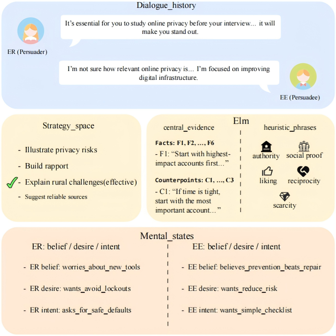论文提出了ToMELP基准,用于系统评估大语言模型是否具备“先推断、再使用”的心智理论能力。该基准引入人格设定(Persona)与精细化加工可能性模型(ELM)双重可控变量,将同一对话状态配对构造成中心路径和外周路径两个版本:前者强调事实与反驳点,后者强调权威、社会认同、互惠、稀缺等启发式线索。同时,ToMELP显式标注说服者与被说服者的信念、欲望和意图(BDI)状态,以及候选策略和目标策略,形成“心理状态推断—策略选择—受控生成—结构化评测”的完整流程。统计结果显示,ToMELP包含473个场景、1829个对话状态,并扩展为3658条成对样本。基于5种代表性大语言模型的实验表明,显式注入ToM信息能够整体提升说服效果,在外周路径下收益更稳定,在冲突、噪声和误导扰动下也表现出更强鲁棒性;但更强的受众对齐并不必然带来更好的路径忠实度,模型仍可能出现“说服更有效、机制更漂移”的现象。该工作为评估大语言模型在个性化说服场景中的有效性、可解释性与可控性提供了新的基准工具。