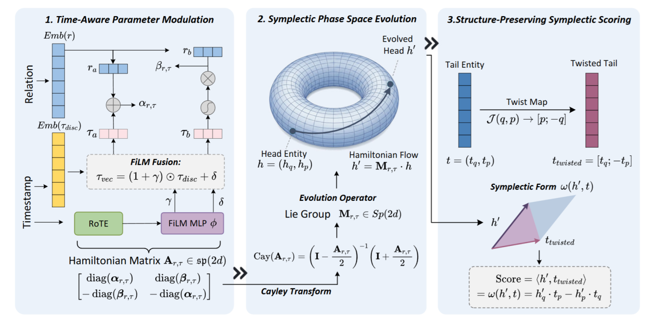 本文提出了一种面向时序知识图谱嵌入(TKGE)的新型建模框架,旨在从根本上提升模型对连续时间动态的刻画能力。随着知识图谱逐步向动态场景扩展,如何高效建模关系事实的时间演化成为关键问题。然而,现有方法大多依赖离散时间戳查表和高维嵌入空间,缺乏对连续时间变化的结构性约束,往往通过参数规模扩张来拟合时间模式,而非从机制层面建模动态过程,导致参数效率和泛化能力受限。为突破这一局限,本文提出TDSym,一个受经典物理启发的时序建模框架,将关系演化过程嵌入到具有严格几何结构的辛相空间中。该方法引入一种结构保持的哈密顿演化机制,通过分块对角的Cayley变换构造时间更新算子,使得演化过程严格受限于辛群Sp(2d)。这一设计在保证相空间体积守恒的同时,实现了线性复杂度的高效计算,从而在表达能力与计算开销之间取得平衡。进一步地,本文设计了时间感知参数调制机制,将连续旋转时间嵌入与特征级线性调制相结合,使模型能够在连续时间轴上实现平滑演化,同时捕捉由事件驱动的非平稳变化。相比传统离散时间建模方式,该机制在保留连续性结构的同时增强了对复杂时间模式的表达能力。理论分析表明,该框架在几何上满足辛结构约束,具备良好的动力学一致性。在多个标准 TKGE 基准数据集上的实验结果显示,该方法在降低嵌入维度的情况下,仍能取得具有竞争力的性能表现。